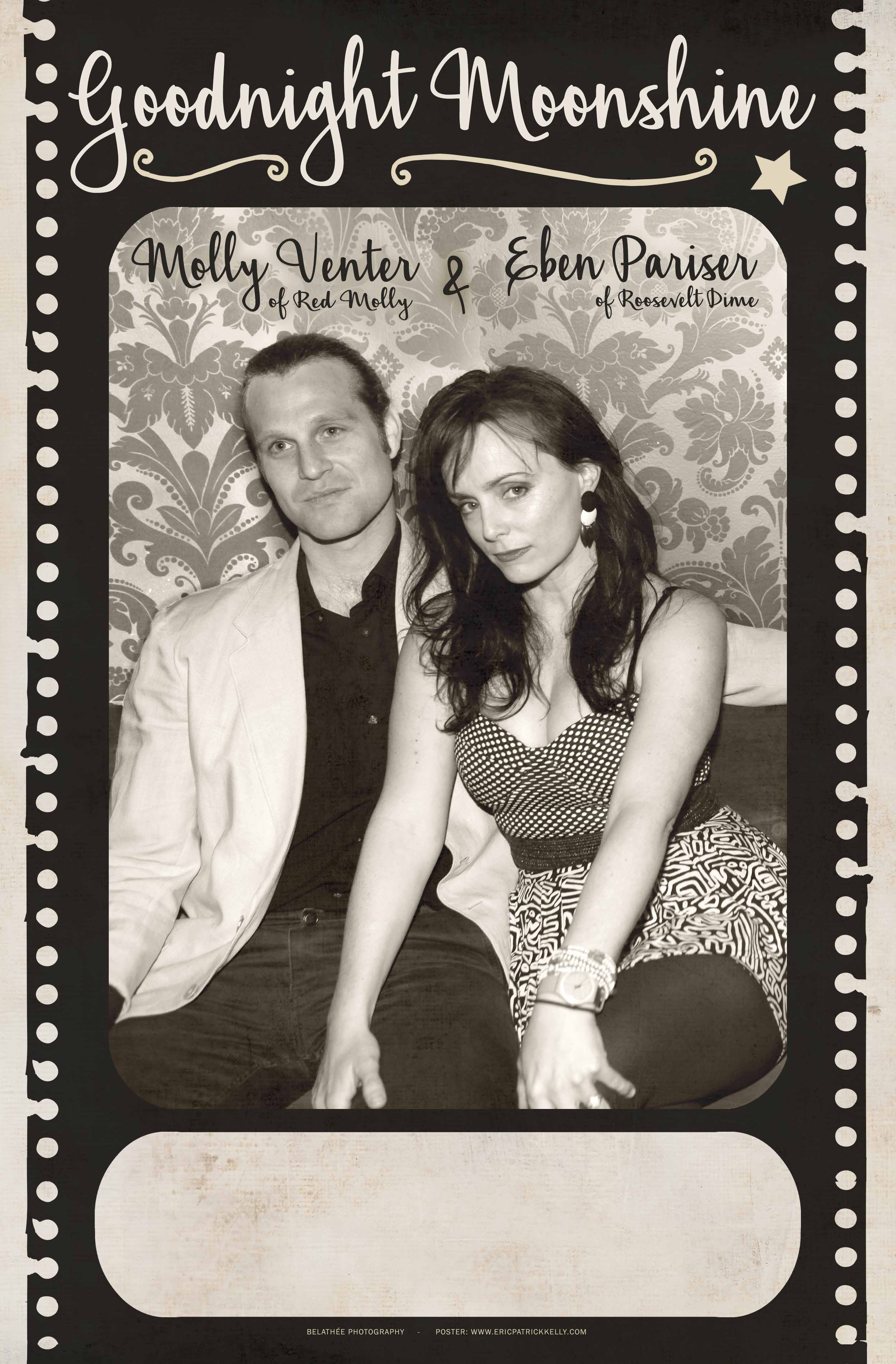 Molly’s voice has caught the ear of industry giants, and been prominently featured on FOX television, Apple Computers and in Warner Brothers films. Molly and Eben’s Co-write "Willow Tree" was a #1 hit on the folk charts in 2014 and was featured in USA Today. Consummate performers, Molly and Eben have also appeared nationally and internationally, 100+ shows a year, with their respective bands Red Molly and Roosevelt Dime. Goodnight Moonshine tours with upright bassist Adam Chilenski; shows are on pause until spring of 2016, as the couple welcomes their first child J. Otis Pariser to the world, born September 10th at 8:35am, in their home in New Haven, CT.