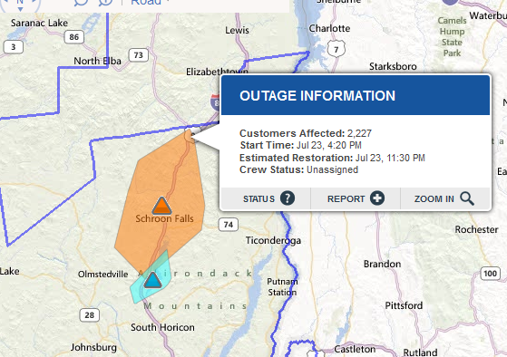 /If you are reading this around 6.30pm on Tuesday night and you are in Schroon -- then lucky you: you've got power. At least 2,227 National Grid customers are without power as of right now -- with the power company predicting total restoration not until 11.30pm tonight.