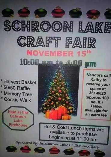 /The Schroon Lake Ladies Auxiliary's Annual Craft Fair kicks off the holiday season tomorrow at the Fire House. There will be goodies and gifts from more than a dozen artists and crafters as well as scenic photos. As always lunch will be served from 11am. For more information call (518) 351-0020. All proceeds benefit the Schroon Lake Volunteer Fire Department. The event runs from 10am - 4pm.