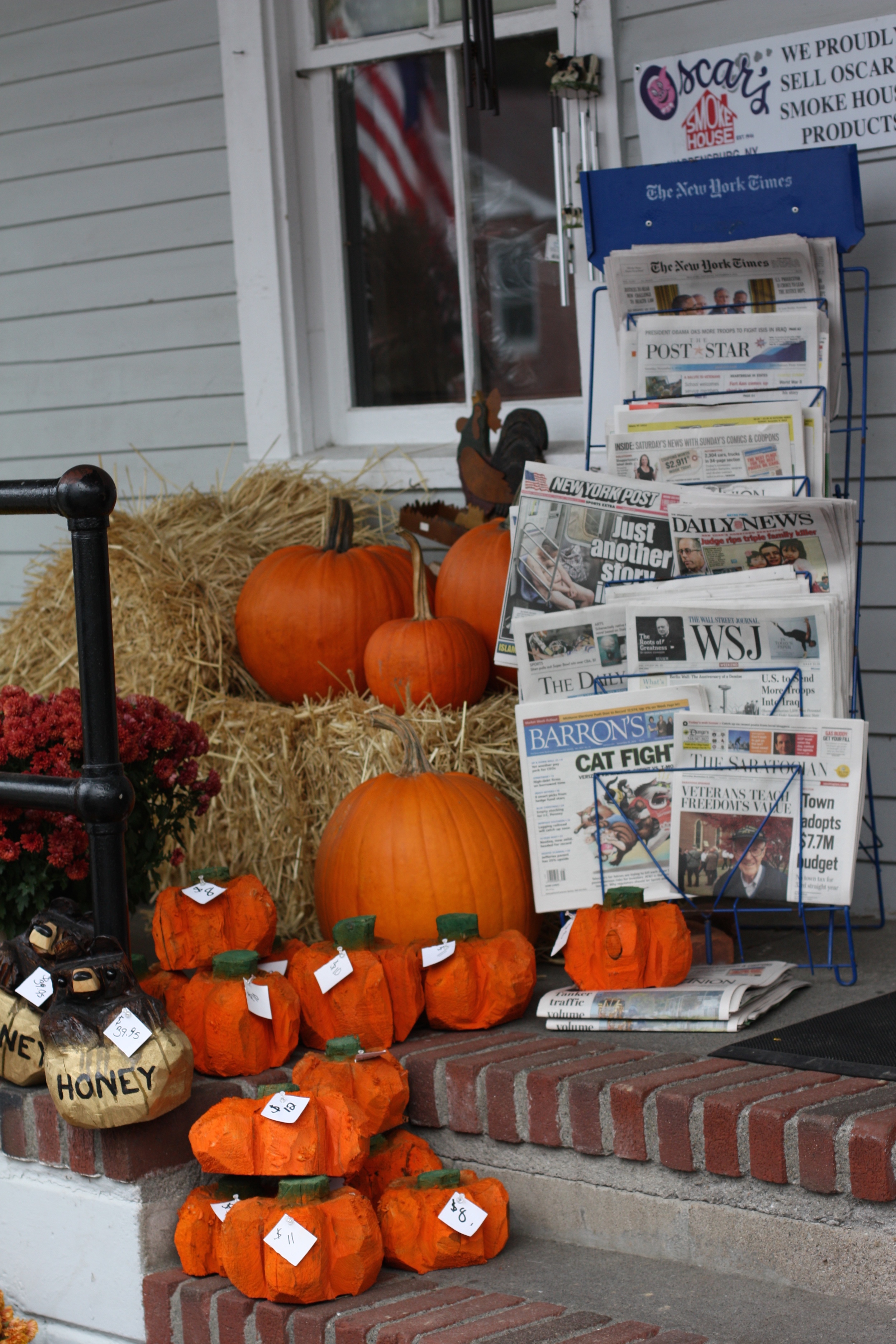 With a foot of snow predicted for our area in the next 24 hours, we'd like to remind everyone that the astronomical winter (Northern Hemisphere) 2014 begins on Sunday, December 21 (and ends on Thursday, March 19). So keep on enjoying those pumpkins!!!)We took this recently on the steps of the Adirondack General Store.