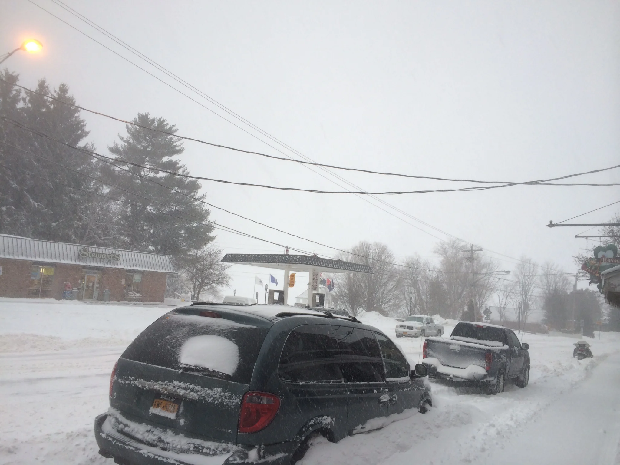/The view from the Timberwolf Pub, from the camera of Paul Mrocka. There's a good eight inches of snow piled high against the green minivan and unless there's a drastic reason for you to be out in this weather in a vehicle -- stay at home. Unless of course, like Paul, you are riding a sled!