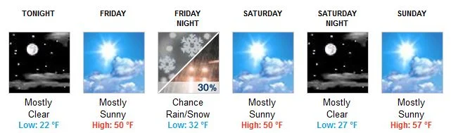 On Friday there's scattered rain and snow showers before 1am in the forecast, then scattered snow showers. Mostly cloudy, with a low around 32. South wind 5 to 7 mph. Chance of precipitation is 30%. Little or no snow accumulation expected.