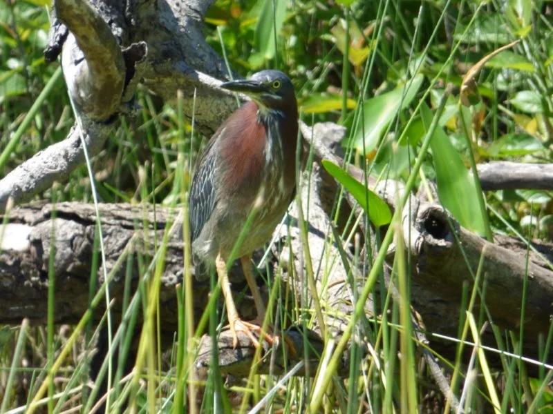 "While out padding, I spotted this little Green-backed heron grooming himself on a log. They favor lake margins and marshes. They are about the size of a crow with bright yellow legs and chestnut colored chest, and a small black crest on its head".
