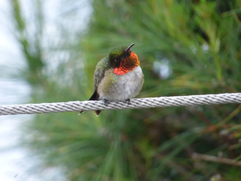 "I thought you might enjoy this little male Ruby throated hummingbird. He loves sitting on my clothes line and watching for other hummingbirds invading his territory. He can be seen in this spot early in the morning and again in the late evening".