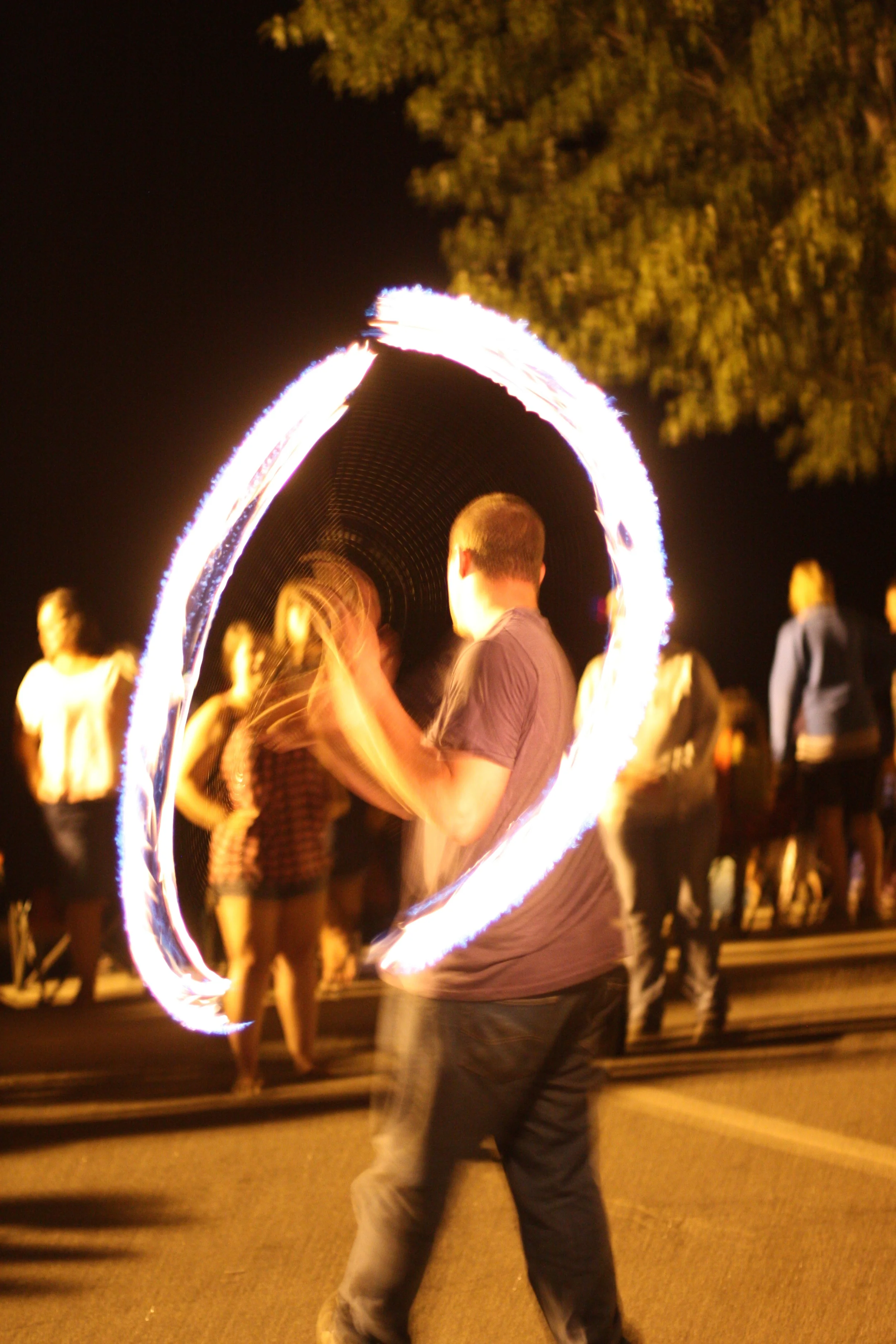 As the band rocked on , just feet away a fire thrower had the crowd mesmerized , as he lit up the night sky.
