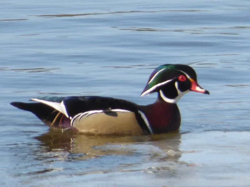 From Pat; "This beautiful male wood duck with his pronounced iridescent green crested head was paddling about on Sunday morning. He probably wintered in the South eastern states or in Mexico and is just returning. He feeds on acorns from pine and white oaks, seeds and corn. Most wood ducks breed in wood pecker cavities or manmade nesting boxes. Last year, we had three young wood ducks in Lockwood Bay of Schroon Lake. Years ago, the boy scouts put out several wood duck nesting boxes in the area. I am delighted to see him and hope he stays in our area".