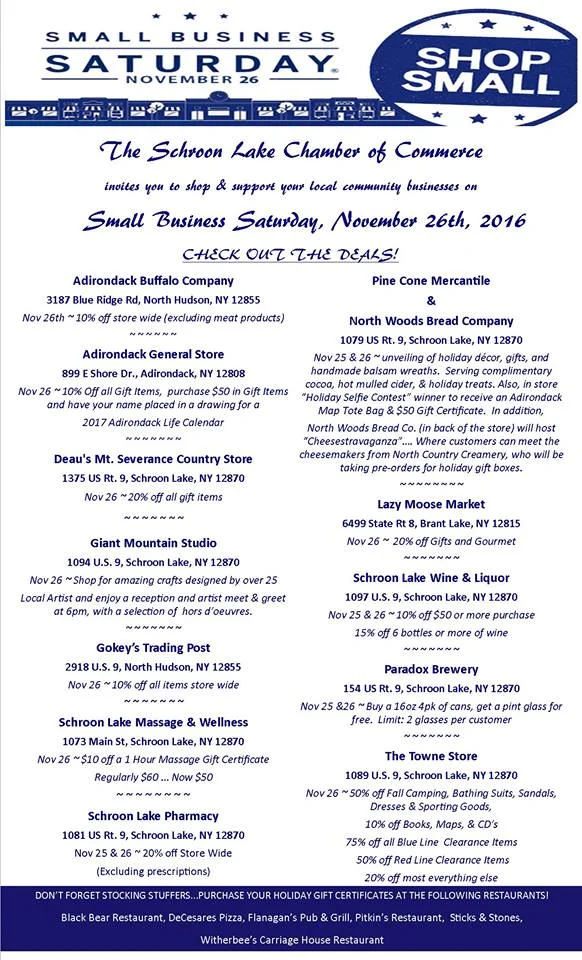 /Embrace the season, shop local and have a great day out. That’s the message from the Schroon Lake Area Chamber of Commerce, who are getting right behind Small Biz Saturday. A huge congrats to Tammy Whitty-Brown, the Chamber's Executive Director.