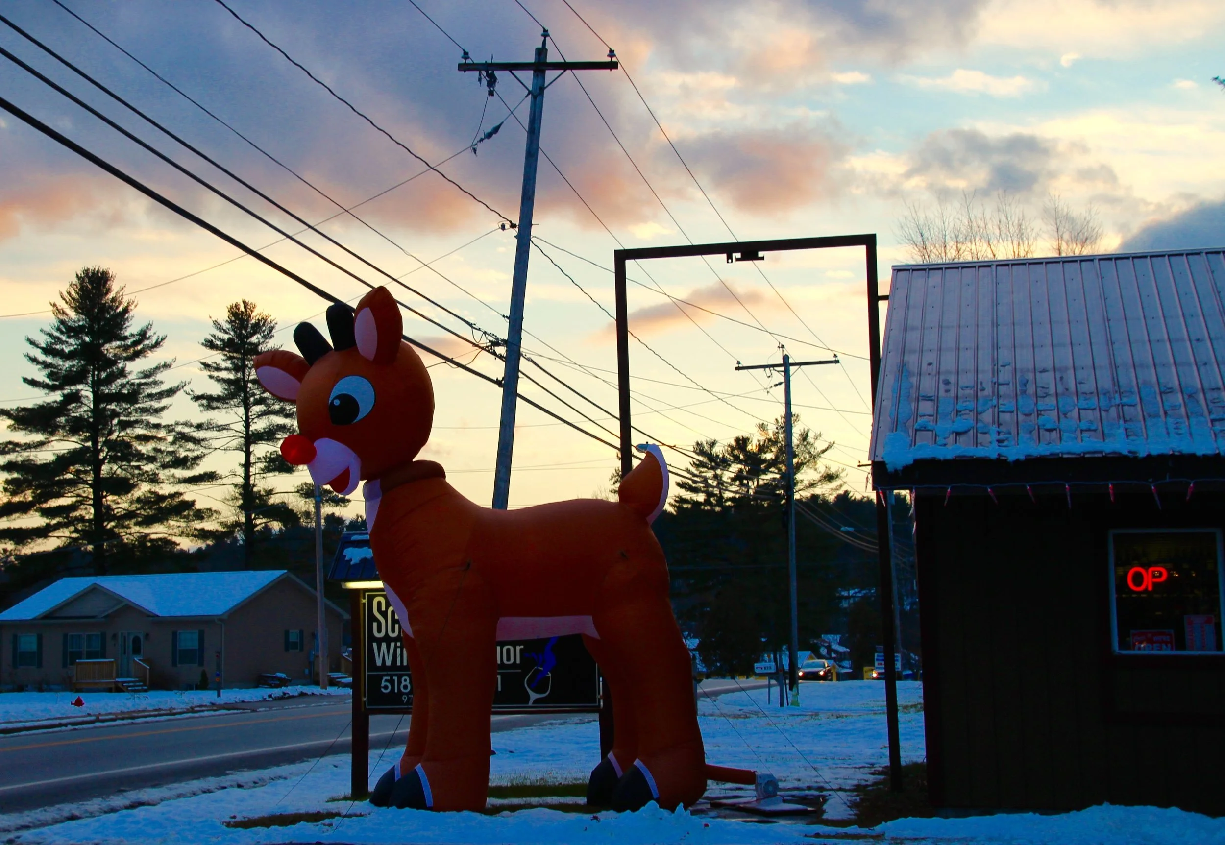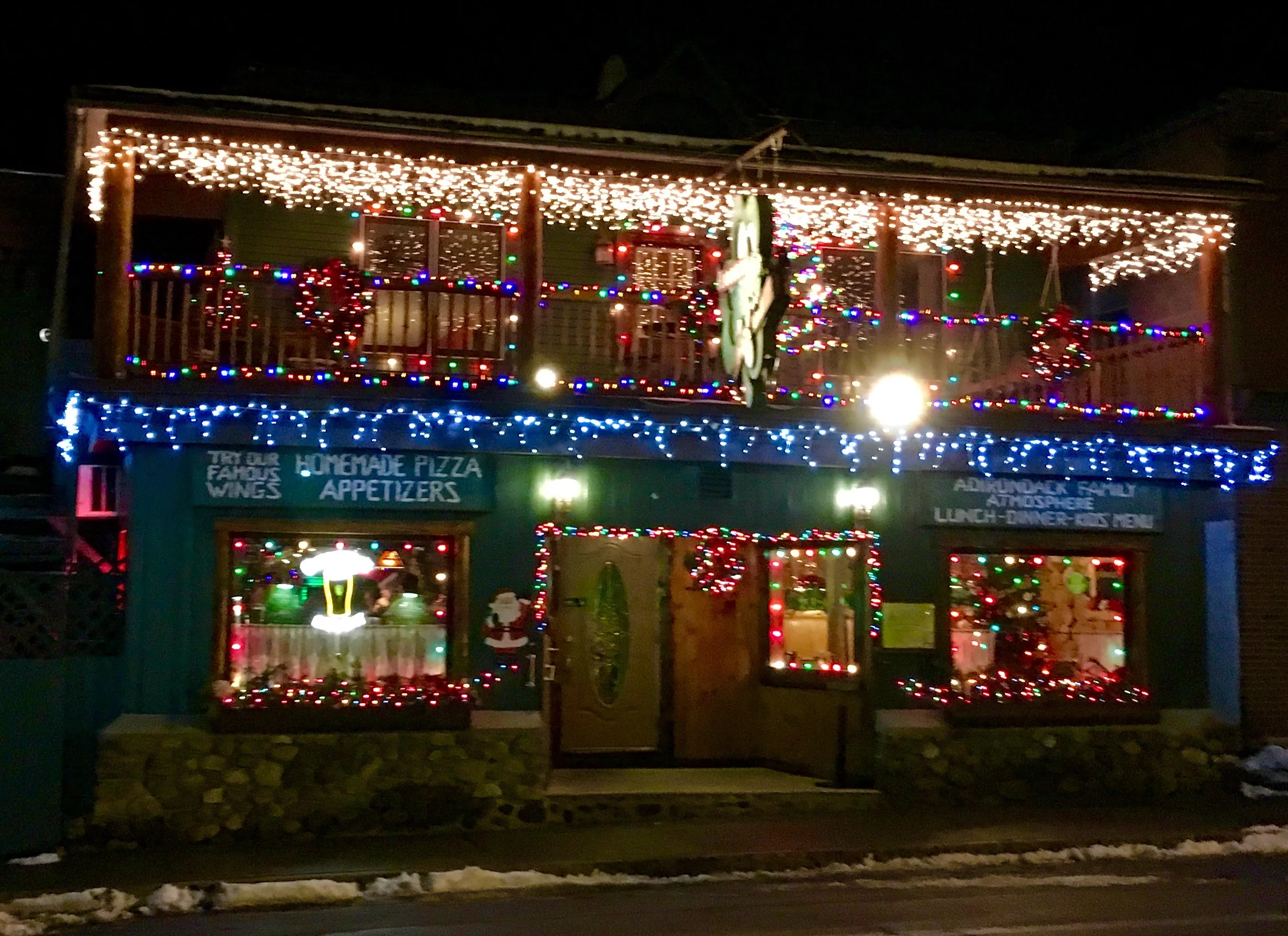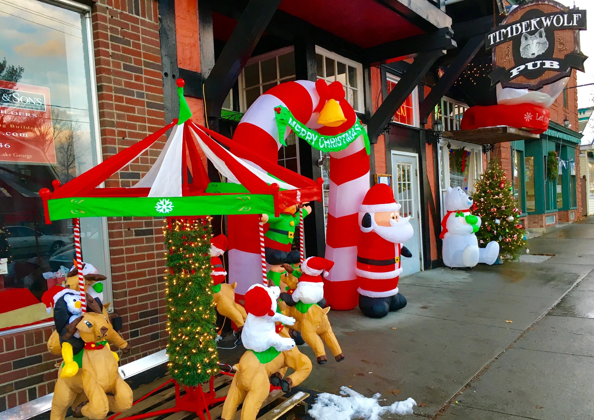 /The sparkle of lights on Main and residential streets is dazzling. If you are not in Schroon and want to get into “The Spirit”, stop on by form a visit. From gigantic blow ups, to window displays featuring authentic Adirondack touches, there’s no mistaking Schroon takes its decorating seriously.