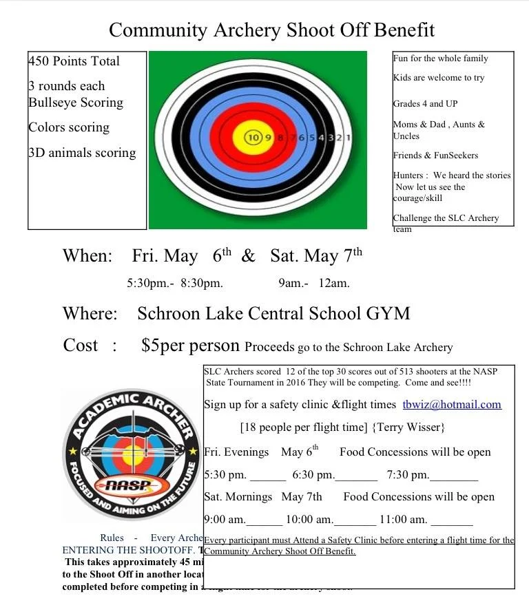 /The archers of the Schroon Lake Central School have thrown down a challenge to area hunters! Come and try and beat them at the Community Archery Shoot Off Benefit. It's tonight and tomorrow morning (Saturday) and every single nickel raised goes straight towards getting a very talented group of Archers to the National Championships in Kentucky in June. Even if you think a bow is something you tie -- and not shoot -- head on over to the SLCS gym and give them a few bucks .