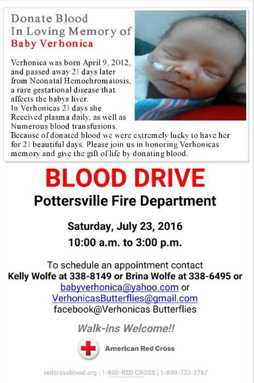 "Please consider giving blood in memory of baby Verhonica on July 23 10 - 3 at the Pottersville Fire Department. Veronica's mom, Brina, works at the Dollar Store and is in a relationship with Frankie Cavoli, wood sculpture across the street from the church (Frank's son). Verhonica's Butterflies "