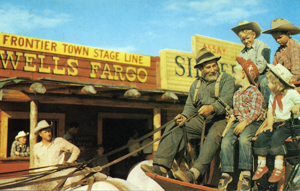The good old days. Young cowboys and cowgirls taking a ride on the stagecoach.