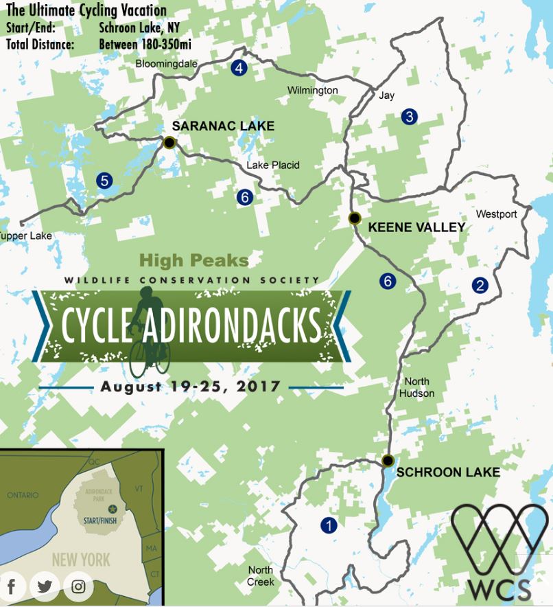 Cycle Adirondacks debuted in 2015, and is sponsored by the Wildlife Conservation Society. Their goal is to conserve the world's wildlife and largest wild places, including the Adirondacks. The ride is designed to take cyclists through different parts of the Adirondacks and connect to several areas that highlight the work of the Wildlife Conservation Society.