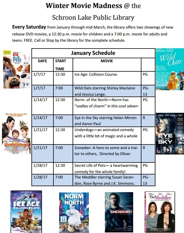 Tomorrow, the Schroon Lake Library kicks off its annual Winter Movies On Saturdays, with the showing of Ice Age: Collision Course at 12:30 pm and Wild Oats, at 7 pm. You can see the full schedule for January and February, by clicking here.