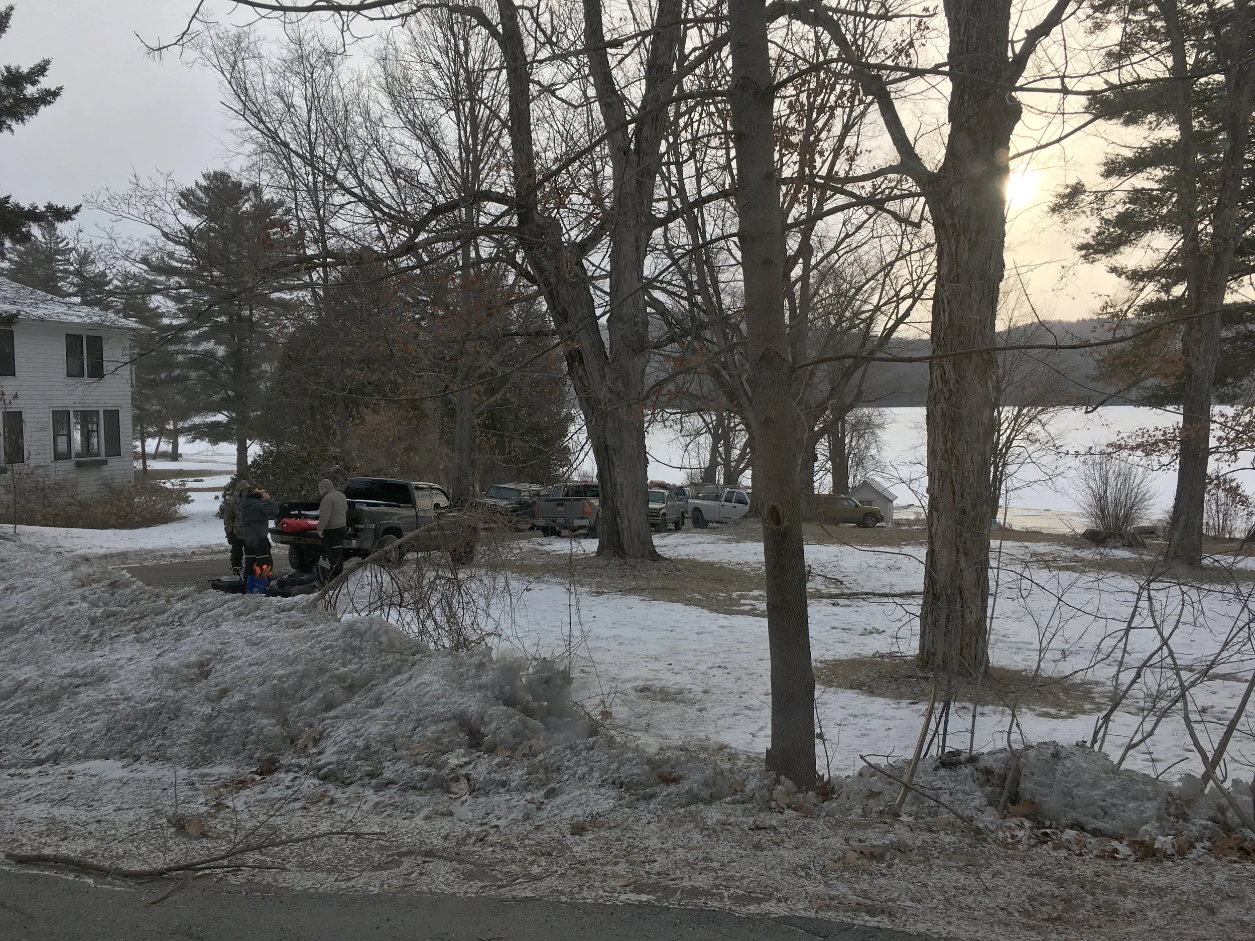 Saturday morning, at around 7:30am, there were several groups getting on the ice via the access road which runs through the old Woods property at the North end of the lake. Several trucks were parked on a town road, referred to as a paper road.