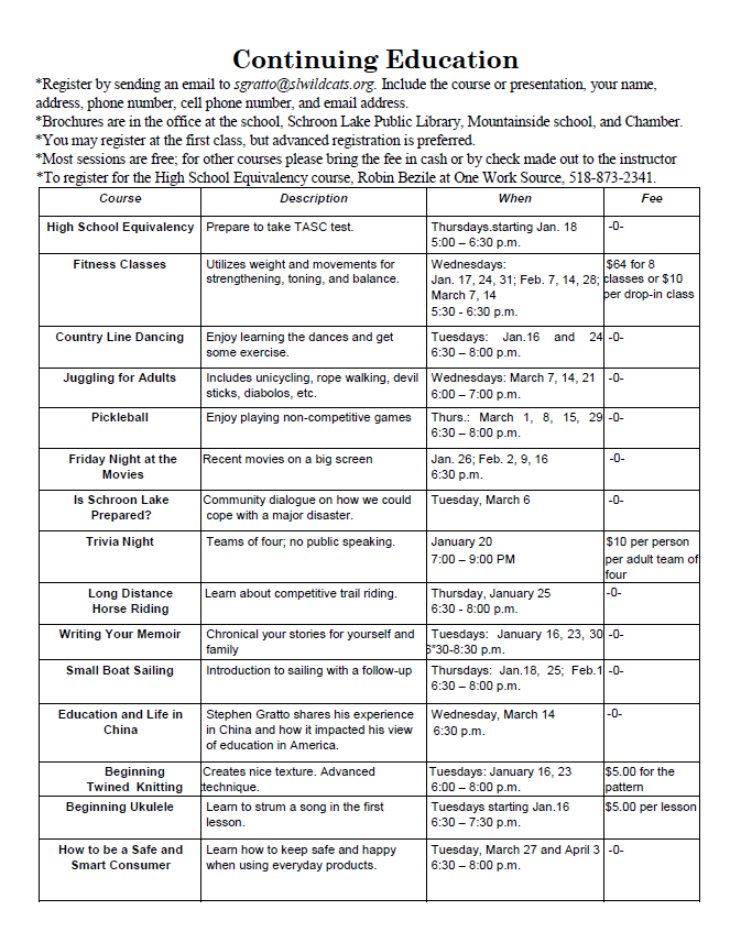 For information, contact the school at 518 532-7164 or email Mr. Gratto at sgratto@slwildcats.org. A full list of the 15 courses offered and their dates, times and fees appear in the graphic above. You may also email Schroon Lake Board of Education member Susan Repko at srepko@slwildcats.org.