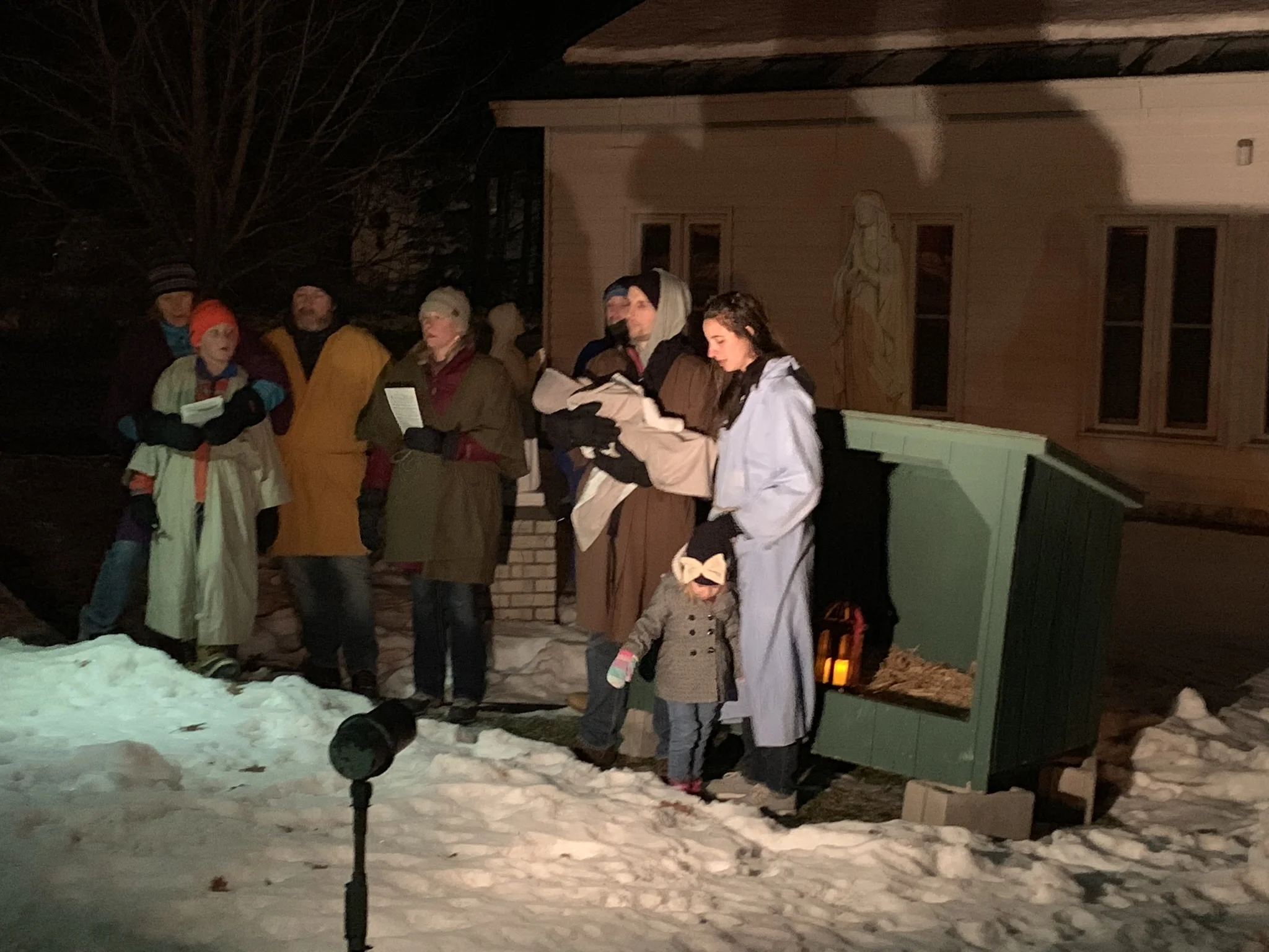 Next stop: the live nativity scene at our Lady of Lourdes catholic church. There was a warm snug baby as Jesus, who cried on queue during Silent Night, cradled in the arms of their mum or dad, playing Mary and Joseph. Cookies, coloring and hot chocolate warmed many at the Senior Center.