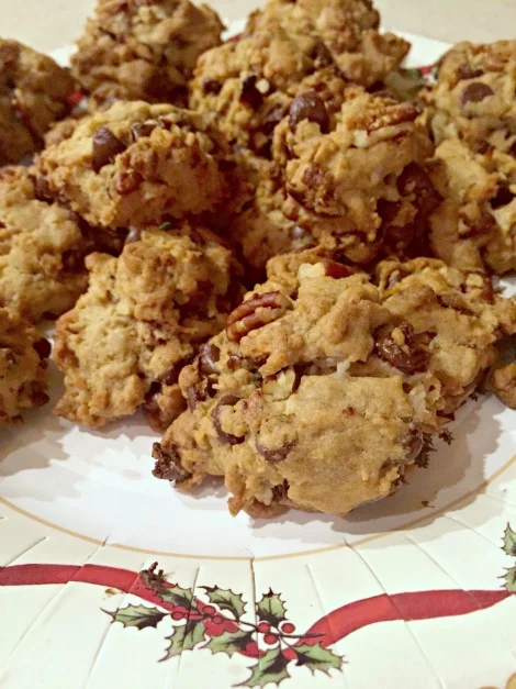 Stir in chocolate chips, coconut and pecans. Drop by tablespoonful on cookie sheets and bake for 12 -1 5 minutes until golden.