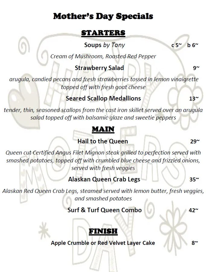 And over at Witherbee's Carriage House, patty and Amanda and Bill invite you to treat Mom to one of their specialties. Beef Wellington, Chicken Cordon Bleu, Cedar Plank Salmon, Prime Rib and many more entrees. Mom gets complimentary Chocolate Covered Strawberries.