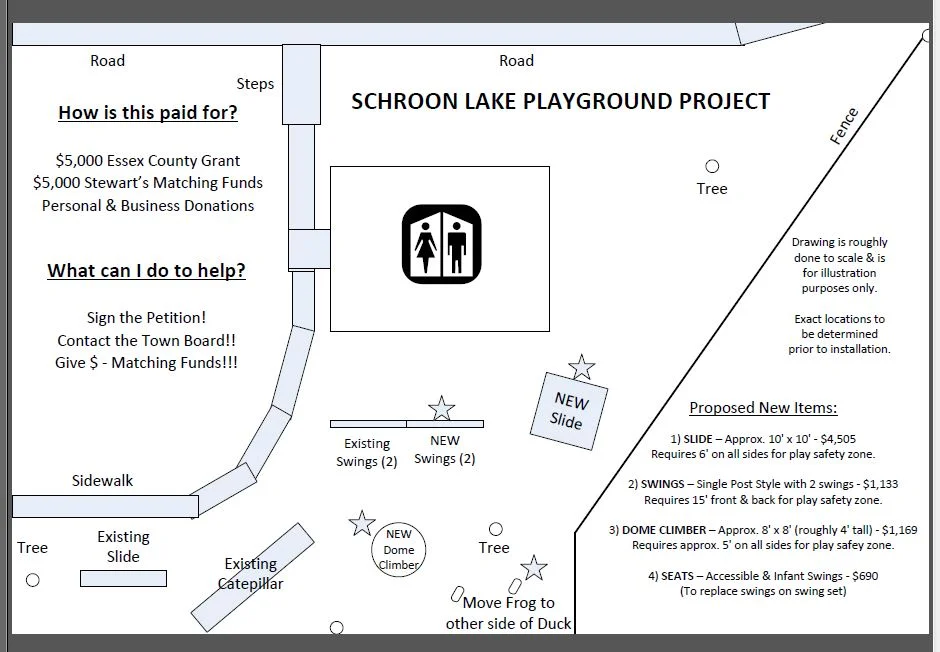 "Among the reasons (for lack of support) is that we've been told that there's no room for the new equipment, but the design we have come up works within the existing footprint of the current playground. We have also been told that there's a great playground at the Schroon Lake Central School. But that's only available after 3pm (and weekends)”.