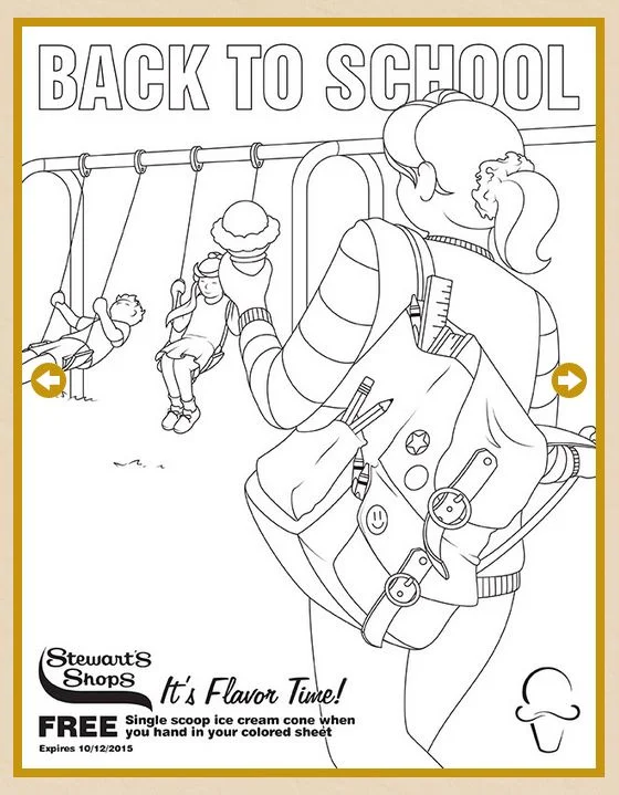 /From Stewarts: "We’re celebrating back to school time with a new coloring sheet! Bring it back to the shop all colored in and get a free single scoop ice cream cone. Now that’s a sweet deal! The offer is valid through October 12. It’s flavor time!"