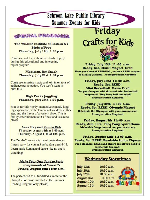 /For locals and our summer visitors -- Schroon continues to wear its crown proudly of being the Kids Capitol of the North Country. And there is so much to do this summer. If you haven't discovered this incredible resource, with a dedicated staff, go say hi. The library is located on the second floor of the Town Building.