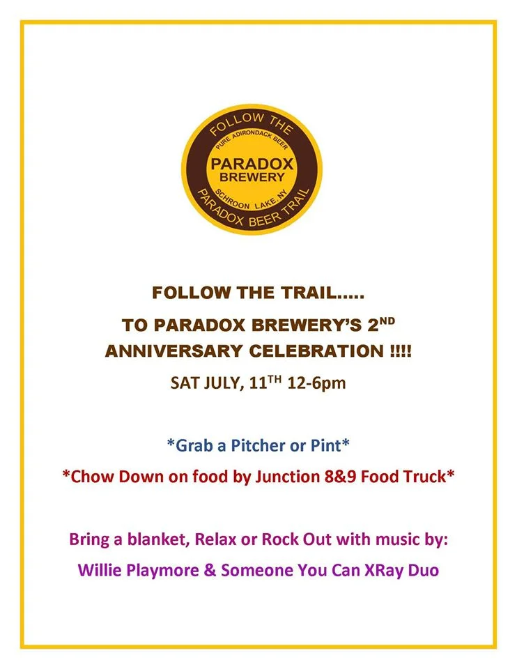 Happy 2nd Birthday to Schroon’s own Paradox Brewery. The party begins at the Brewery at 12 and features two bands and a Food Truck.