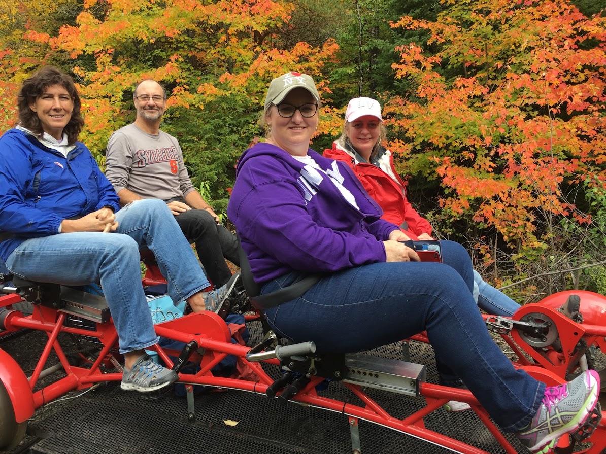 After meeting at Saranac Lake's historic rail station, our group was taken by bus to a clearing in Clear Lake, where our bright red bikes were waiting. (There are two seat and four seat versions. Each comes with a brake and each rider is required to wear a seat belt).