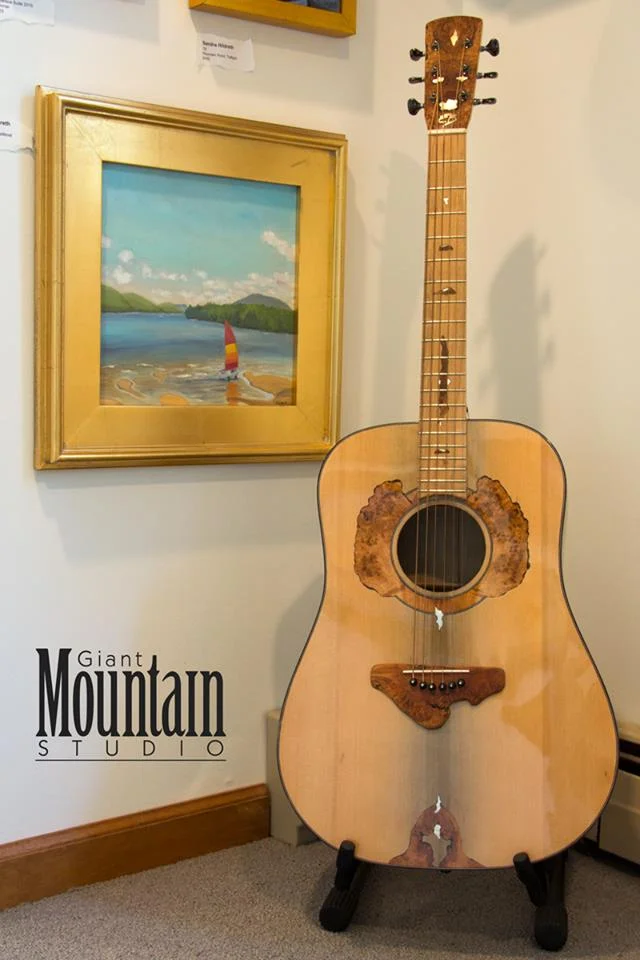 Across the street there's the Giant Mountain Studio and the work of an extraordinary group of artists. Above is a beautiful painting of Schroon Lake by Sandra Hildreth painted during the Schroon Lake Association's Hobie Cat Sailing Regatta and a stunning guitar by Eric Bright made using "sinker" woods and locally harvested burls. This gallery is a jewel.